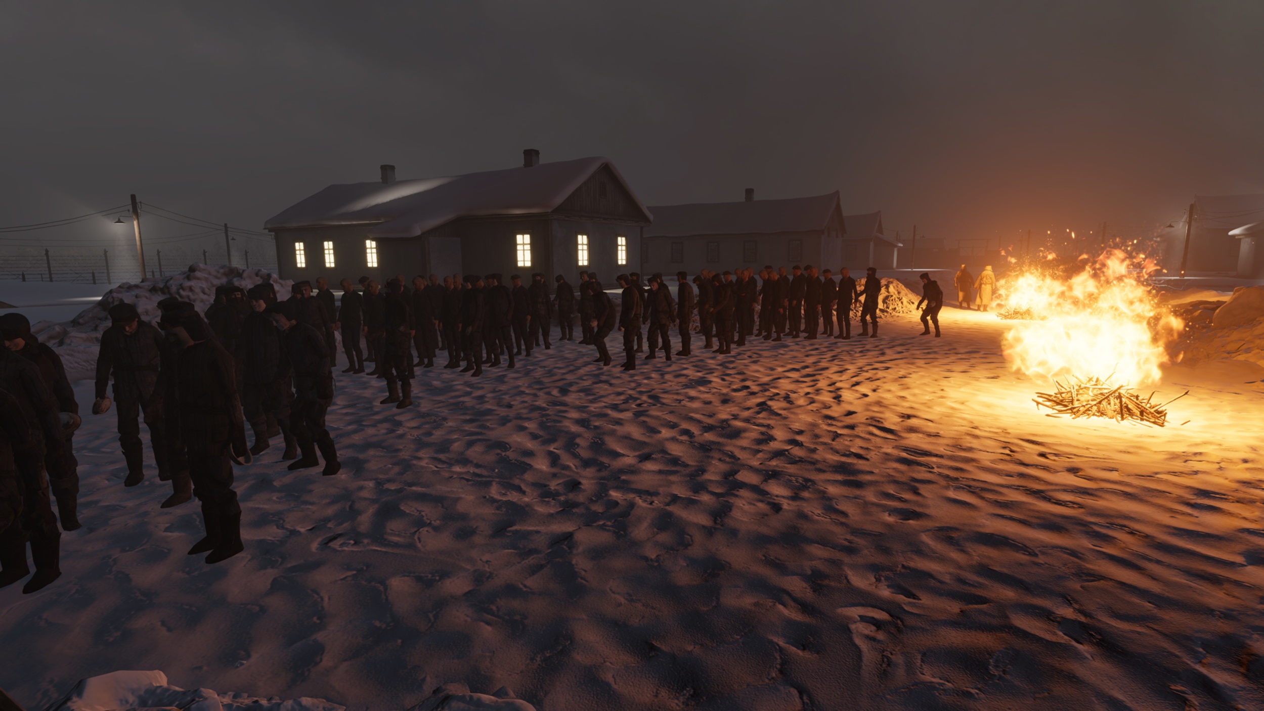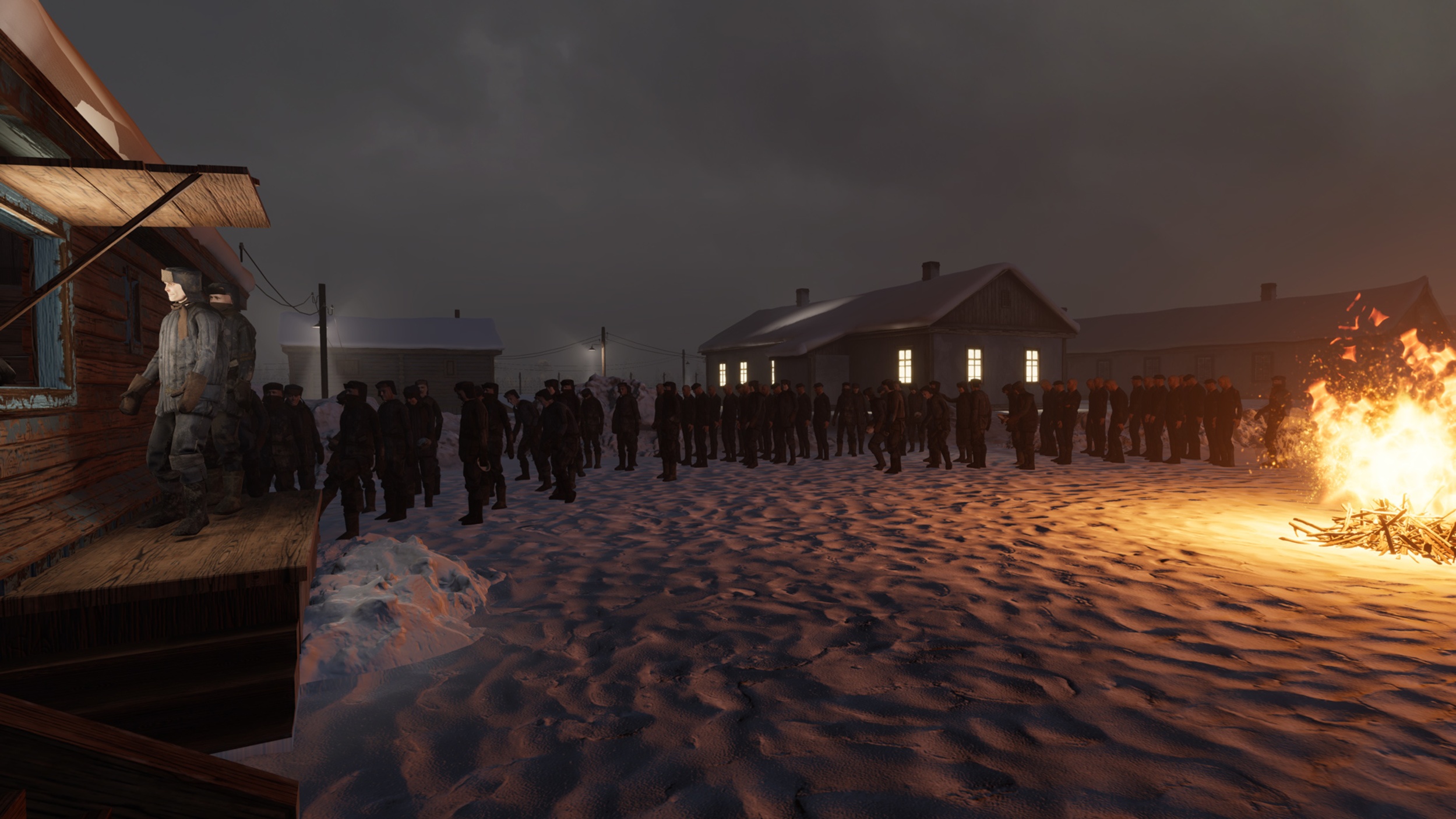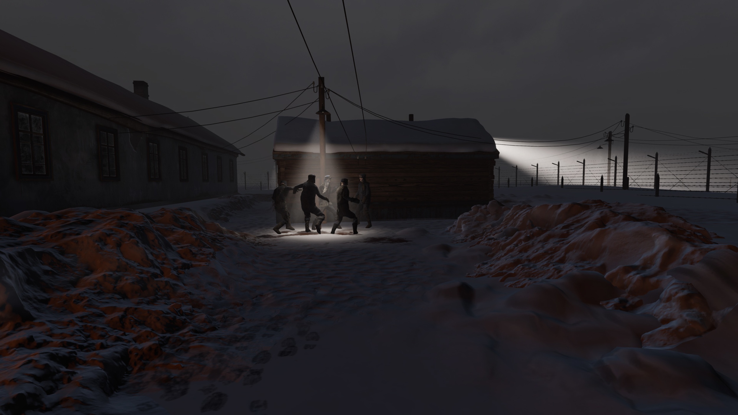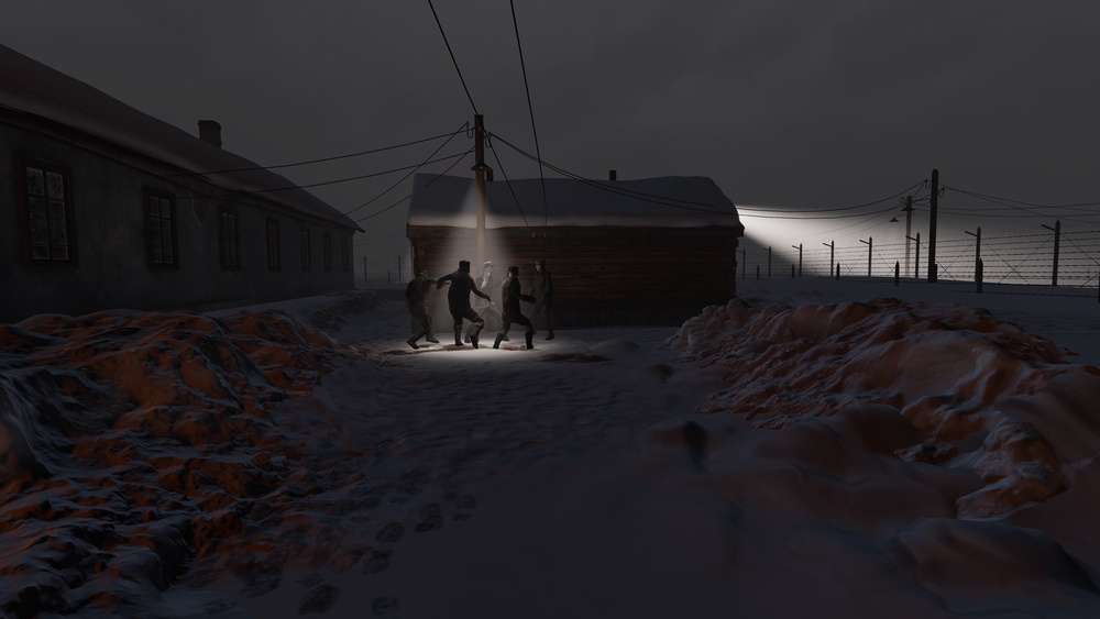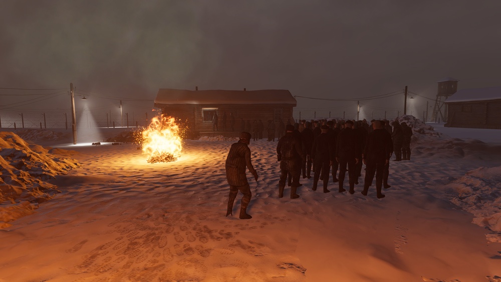- Hráč čeká na příděl spolu s ostatními vězni. Sleduje frontu zuboženého stáda, smetiště u jídelny s „dochoďáky“ a dozorce.